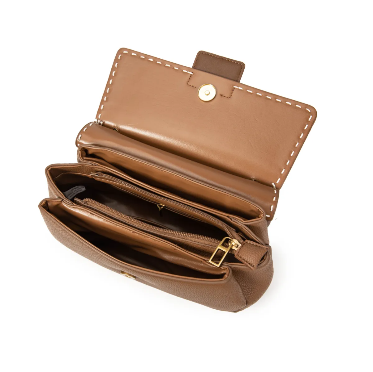Bolso bandolera elegante con pespuntes y cierre moderno.