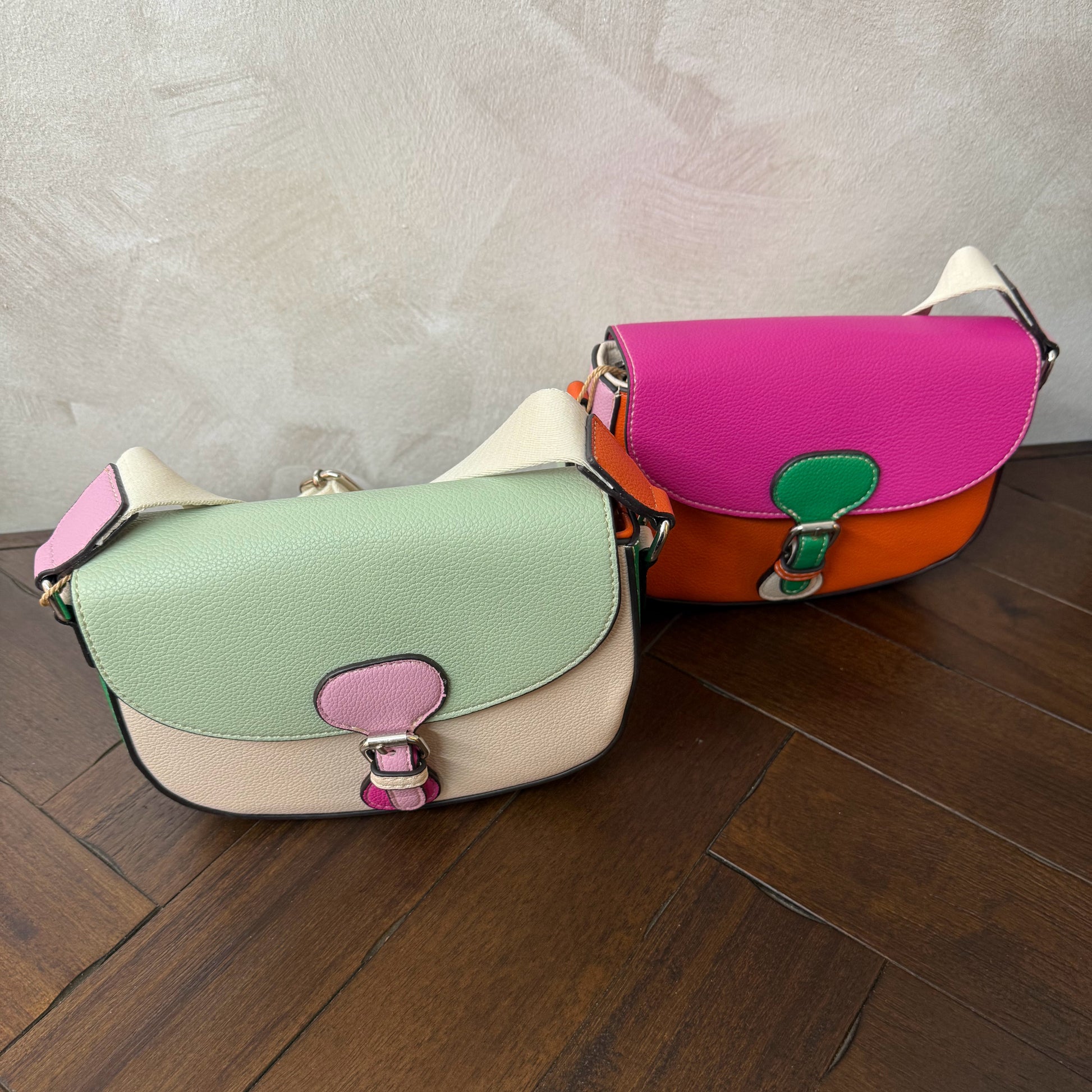 Bolso de estilo bandolera pequeño con un diseño muy llamativo y moderno gracias a su combinación de colores vivos: