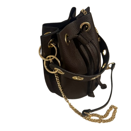 Este bolso bombonera de estilo moderno combina elegancia y funcionalidad. Fabricado en piel de vacuno, destaca por sus detalles metálicos dorados y su original diseño con ojales, que aportan un toque sofisticado y actual. Su cierre ajustable con cordón garantiza comodidad y seguridad, mientras que la cadena dorada con correa de piel permite llevarlo tanto al hombro como cruzado. El tono marrón chocolate lo convierte en un accesorio versátil, ideal para elevar cualquier look de día o de noche.