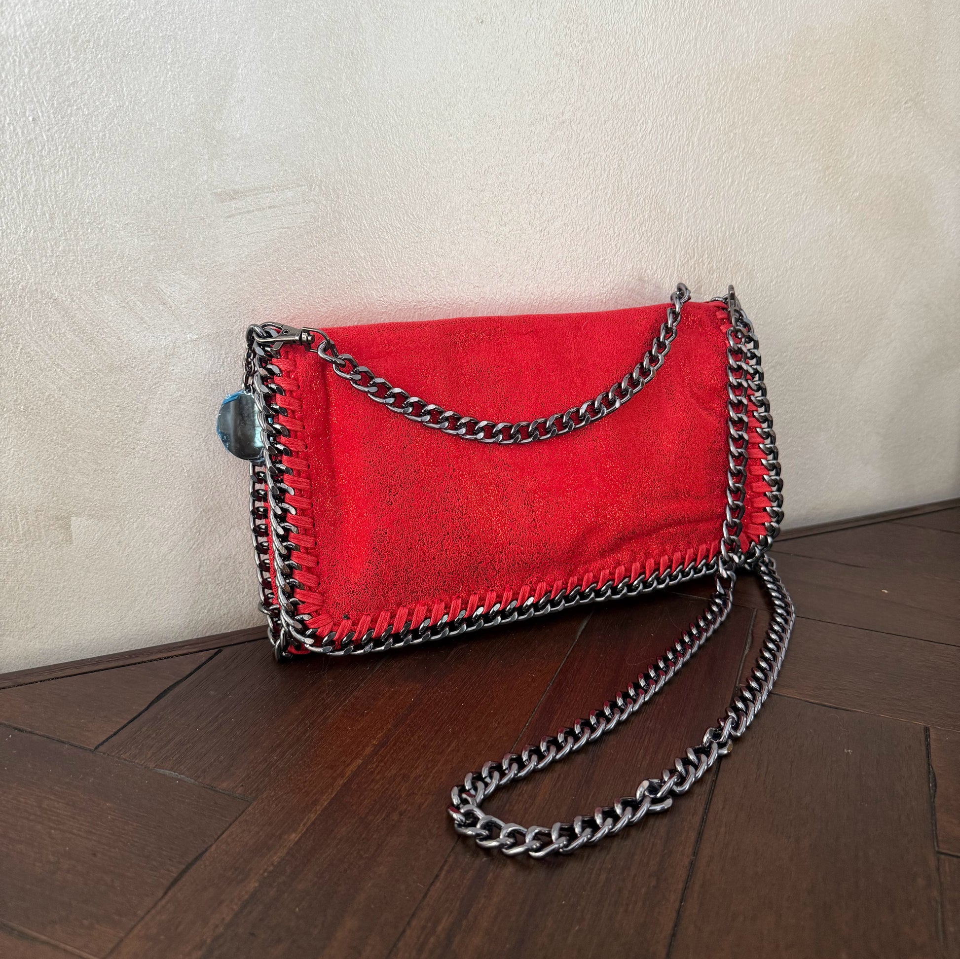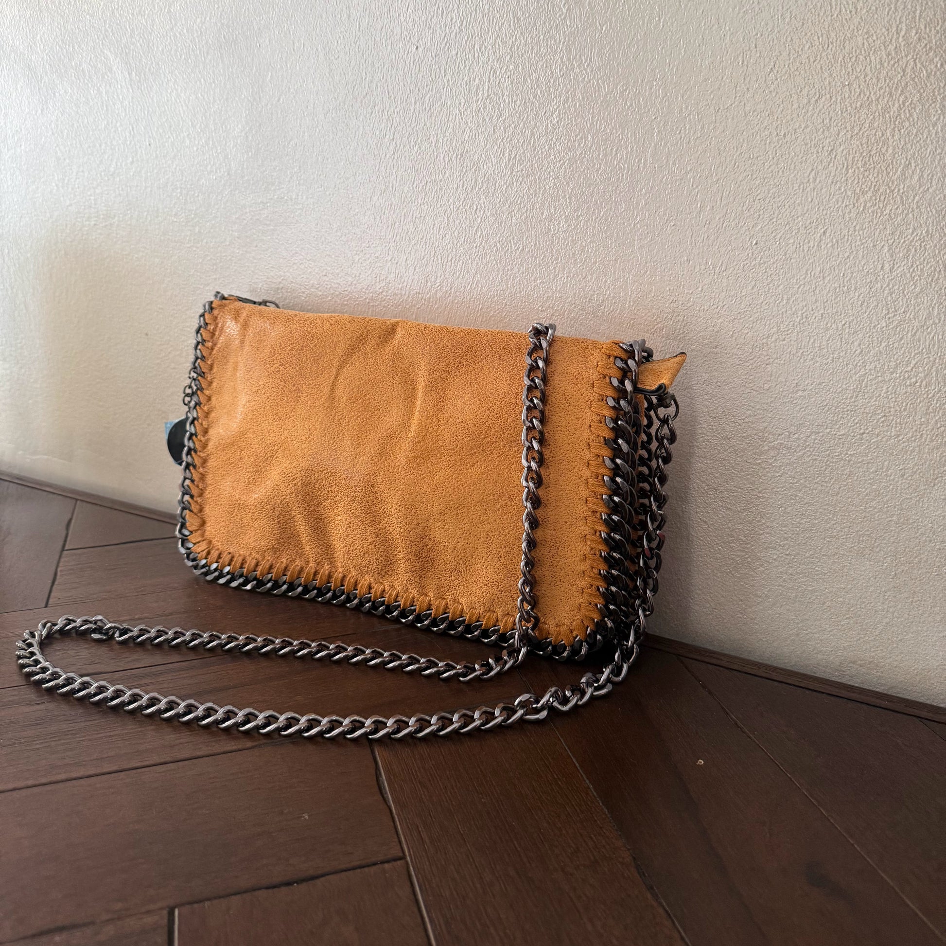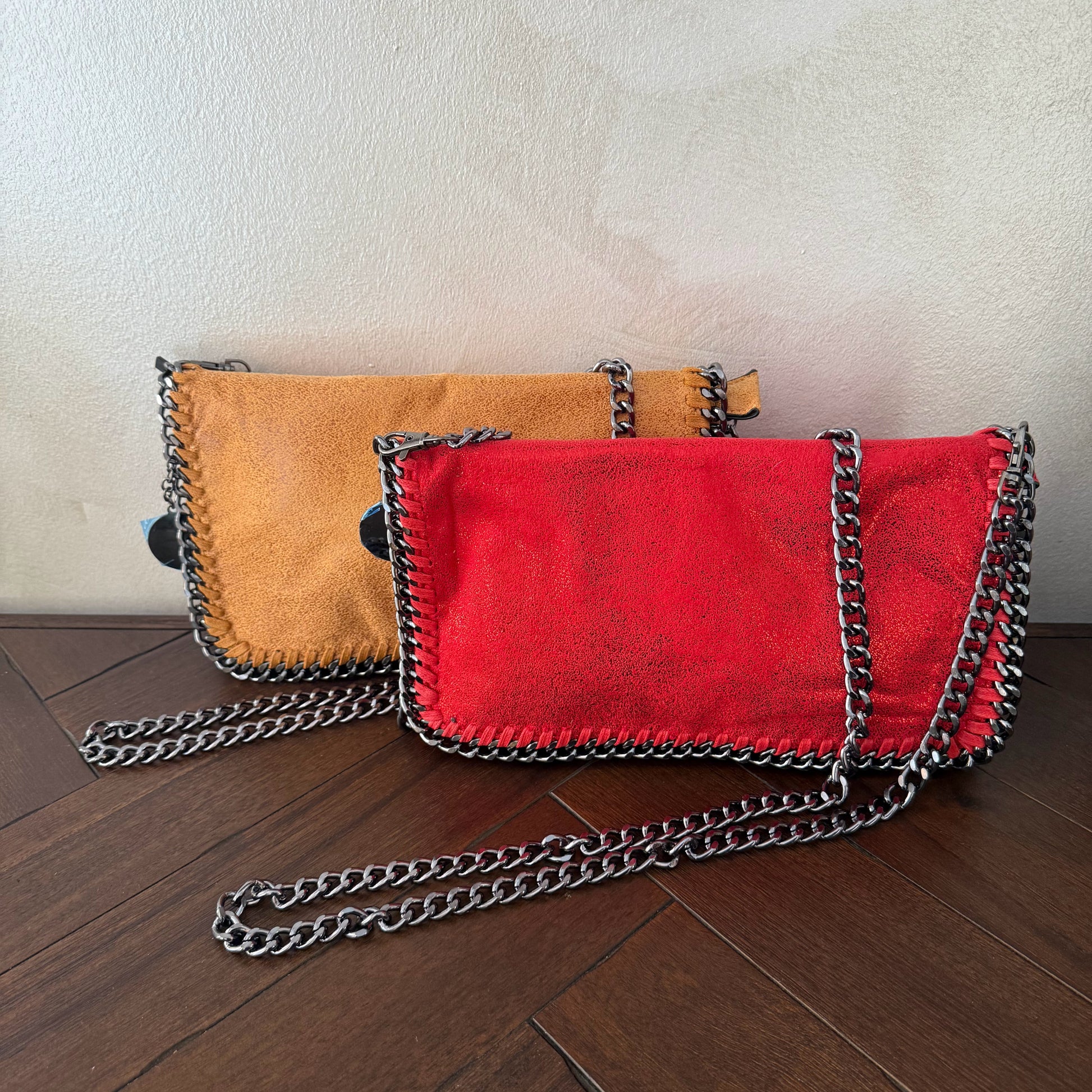 Borde decorado con cadena metálica entrelazada que rodea todo el bolso.
