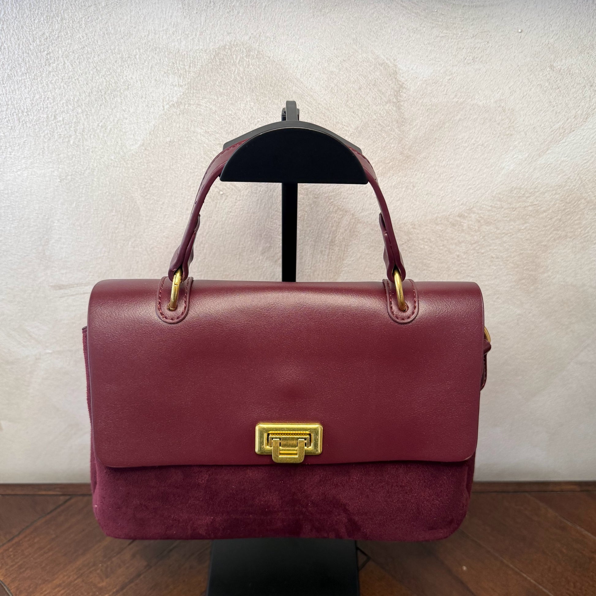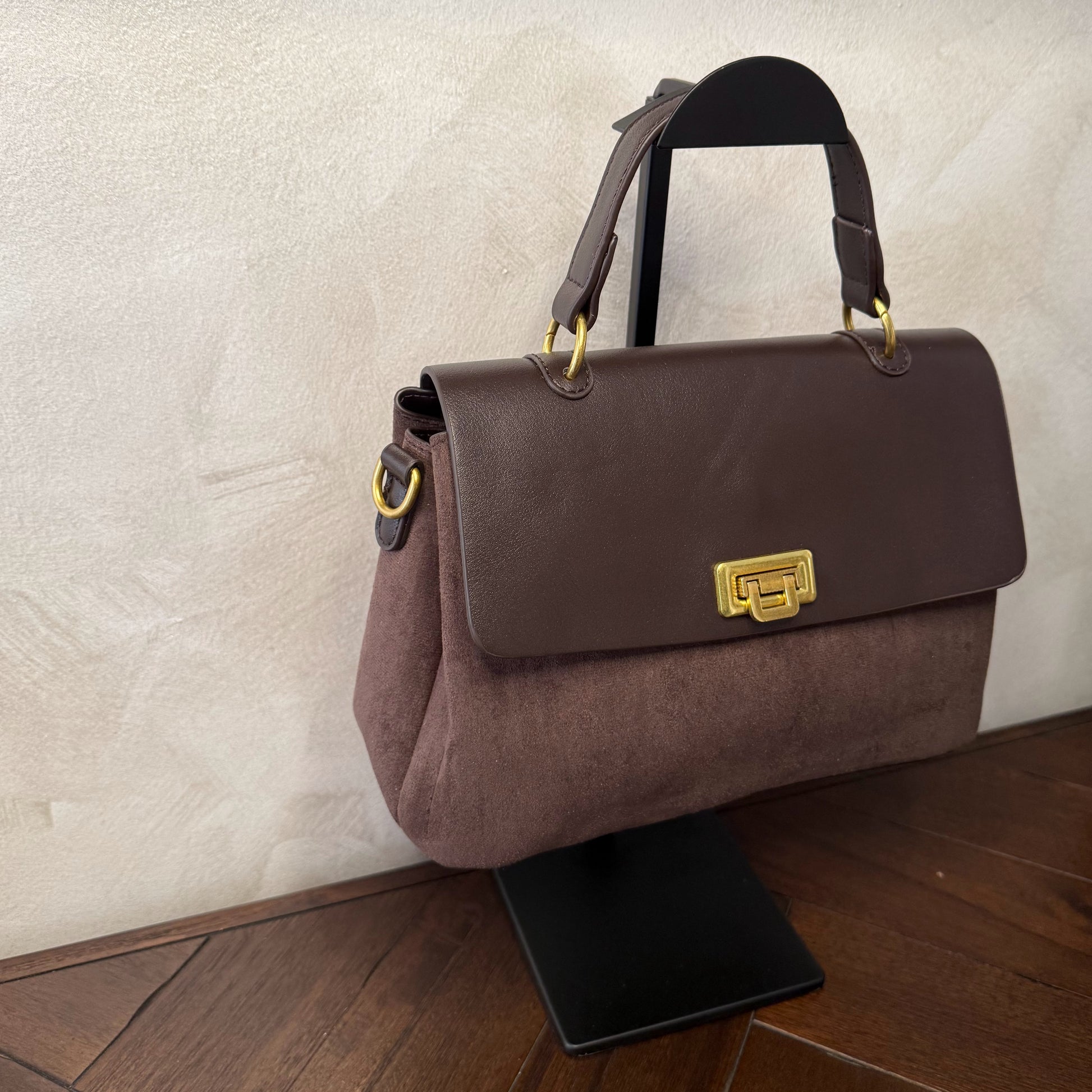 Un modelo elegante y sofisticado que destaca por la combinación de texturas en ecopiel lisa y ante, con herrajes dorados que aportan un aire clásico y chic. Incluye asa corta para llevar en mano y asa bandolera desmontable para mayor versatilidad.