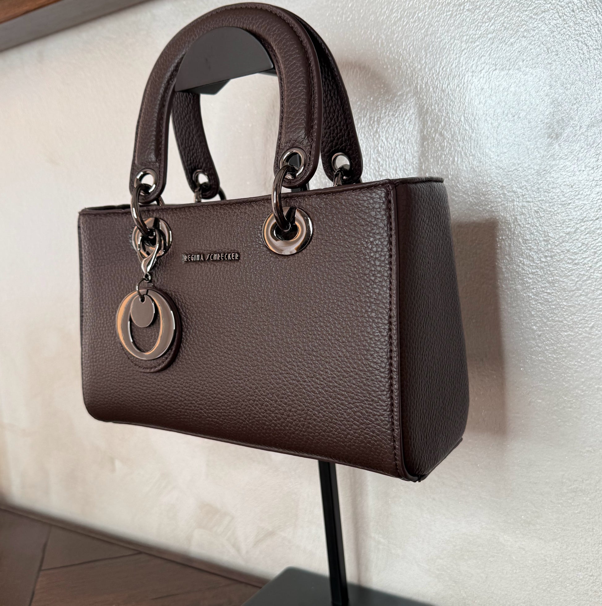 Bolso de mano con asa larga y colgante metálico