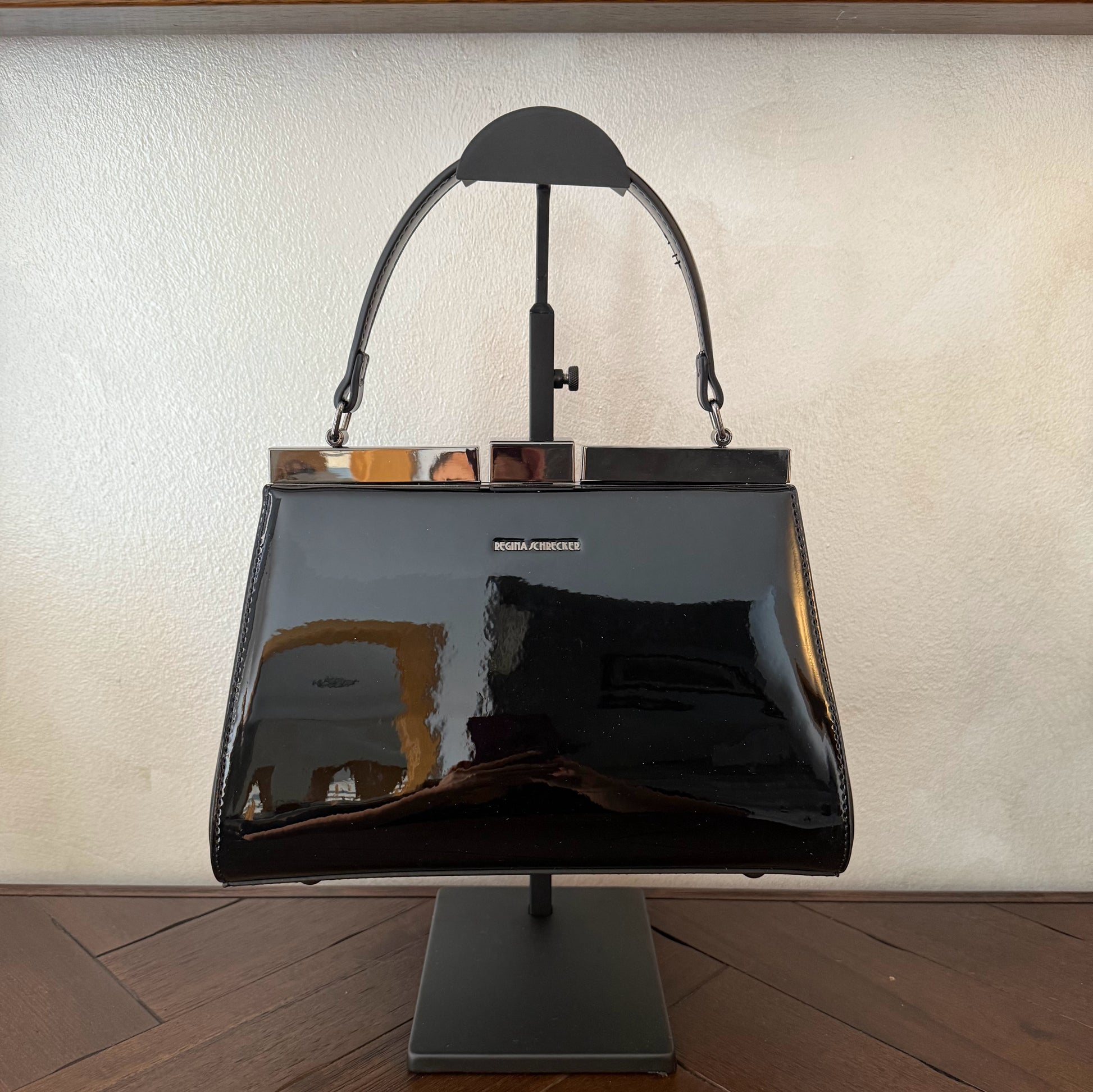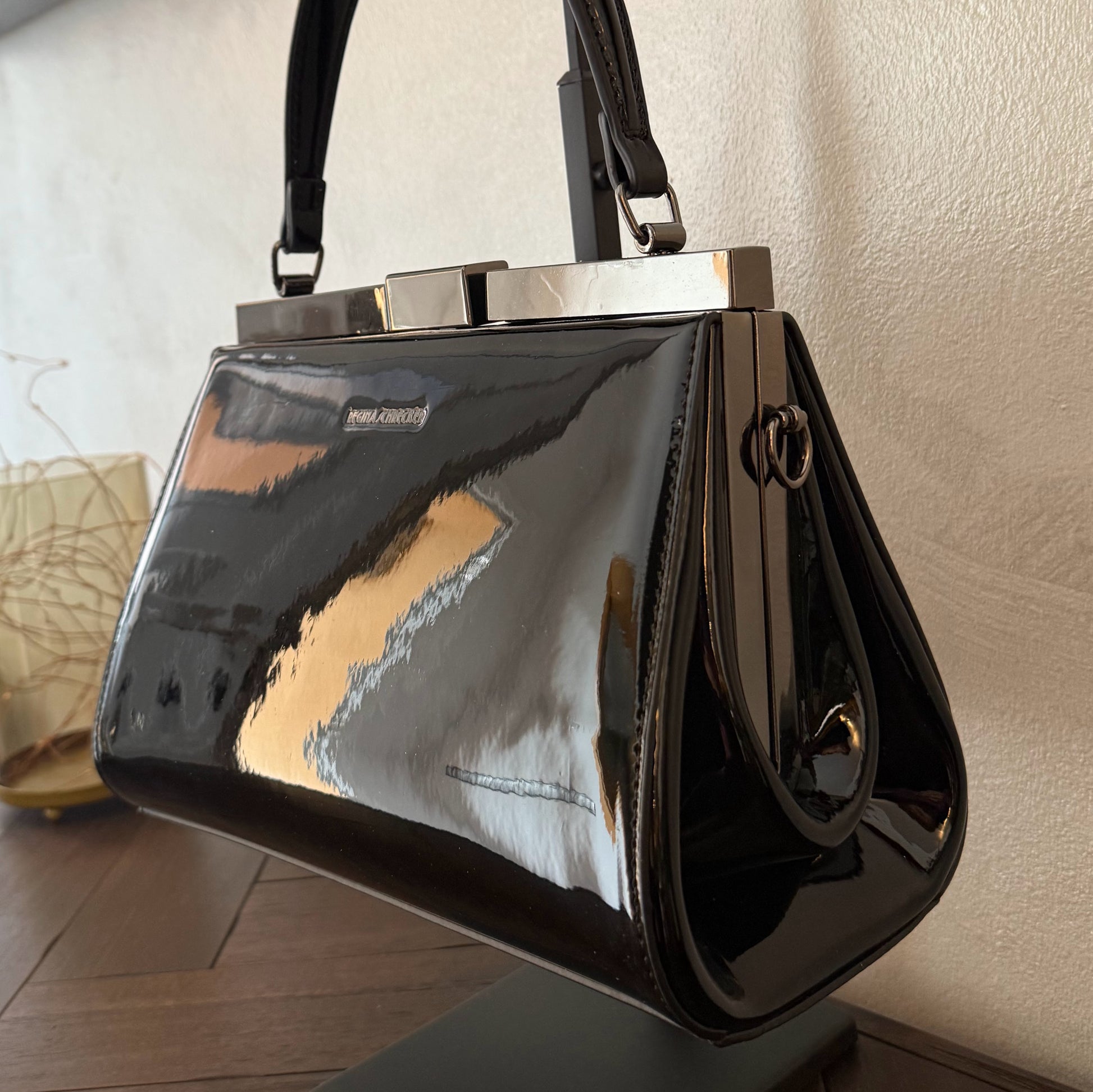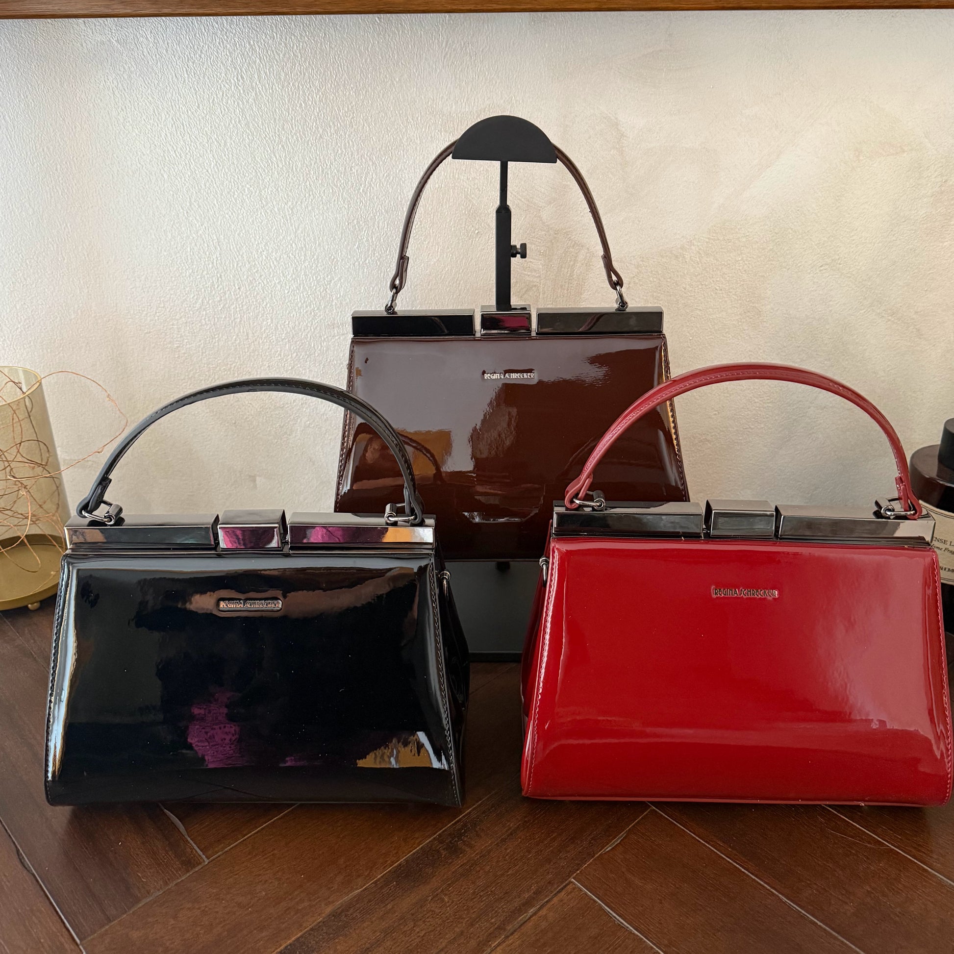 Bolso de mano de charol con acabado brillante que aporta un toque sofisticado a cualquier look. Su diseño estructurado y elegante cierre metálico en la parte superior lo convierten en el complemento ideal para ocasiones especiales o eventos formales. Incluye asa rígida para llevar cómodamente en la mano y espacio suficiente para llevar lo esencial, dispone de asa larga para colgar. Disponible en colores clásicos como negro, marrón y rojo, perfectos para combinar con cualquier outfit.