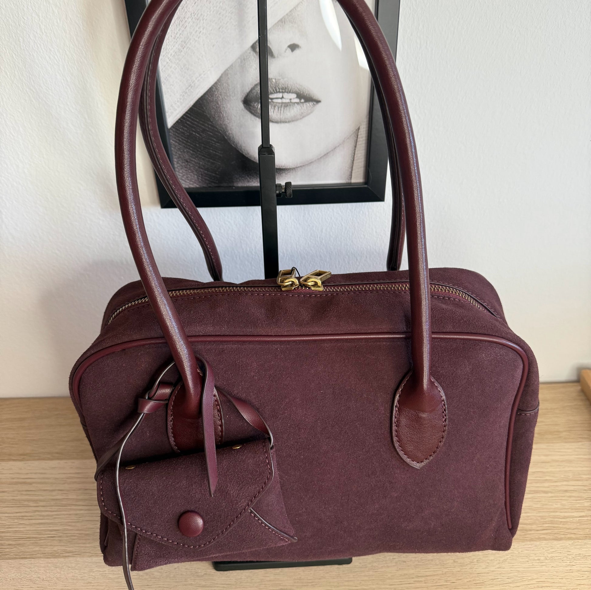 Este bolso estilo premium en color burdeos es la pieza perfecta para elevar cualquier look. Su textura efecto ante y los detalles en asa y borde en piel sintética le dan un acabado elegante y sofisticado. Incluye mini monedero a juego colgado del asa, ideal para llaves o tarjetas.