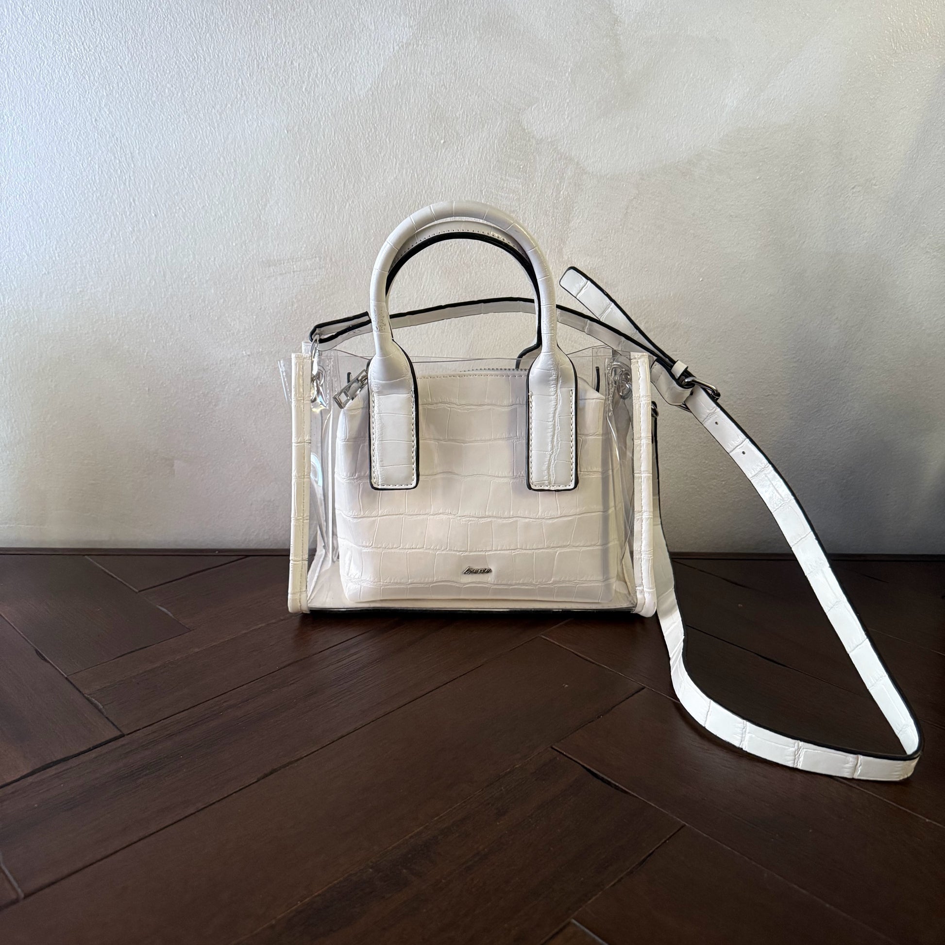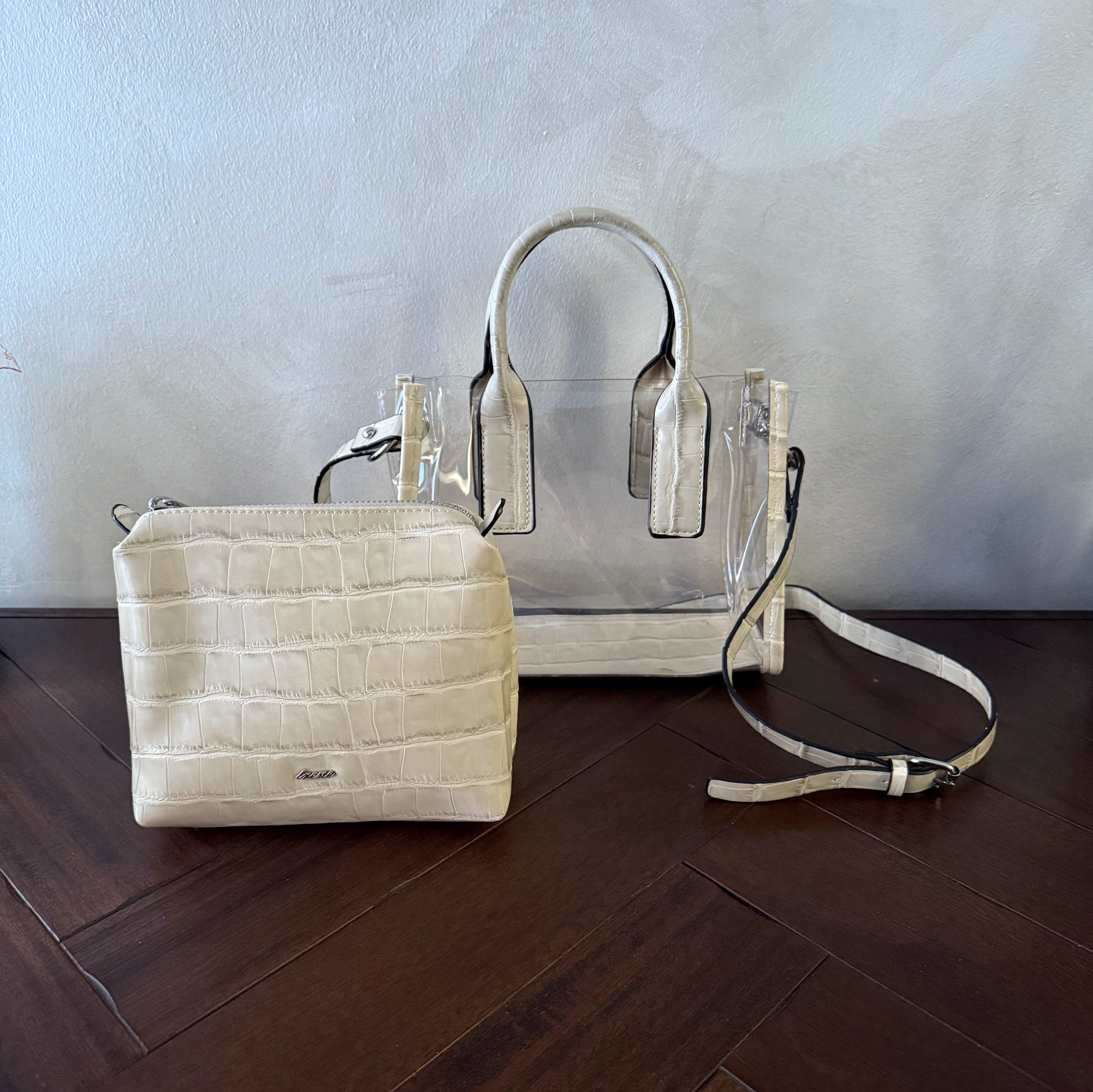 Este bolso combina estilo moderno y versatilidad en un solo diseño. Su estructura transparente le da un aire fresco y actual, mientras que el neceser interior extraíble en piel sintética con textura efecto cocodrilo aporta un toque elegante y sofisticado.