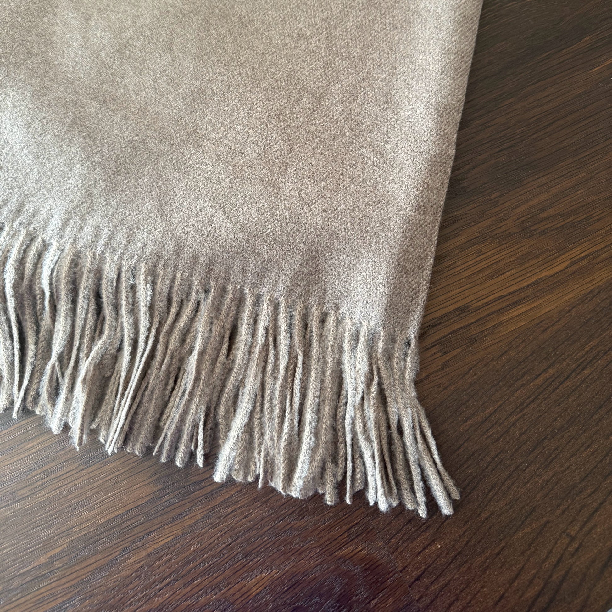 Bufanda fina en poliéster con flecos en color beige.