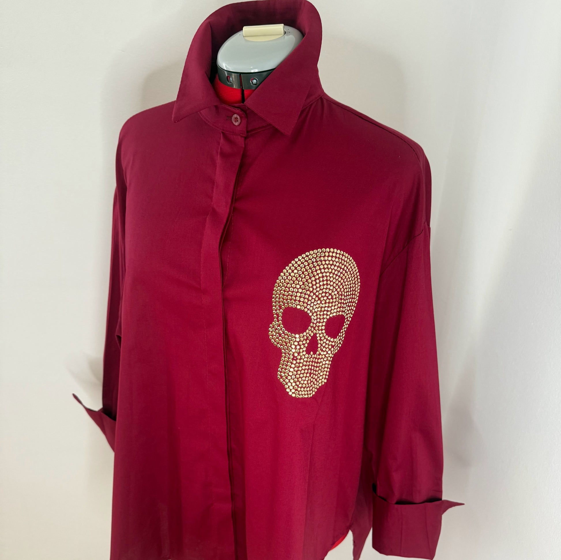 Camisa de corte oversize en color burdeos, confeccionada en tejido 100% Algodón, ligera y suave que aporta comodidad y movimiento. Destaca por su diseño atrevido con calavera de strass en el pecho y una gran calavera en la parte trasera, que le da un aire moderno y rebelde. Presenta cuello clásico, cierre de botones oculto en la parte frontal y mangas largas con puño amplio. Ideal para combinar con vaqueros o leggins, consiguiendo un look urbano con un toque sofisticado.
