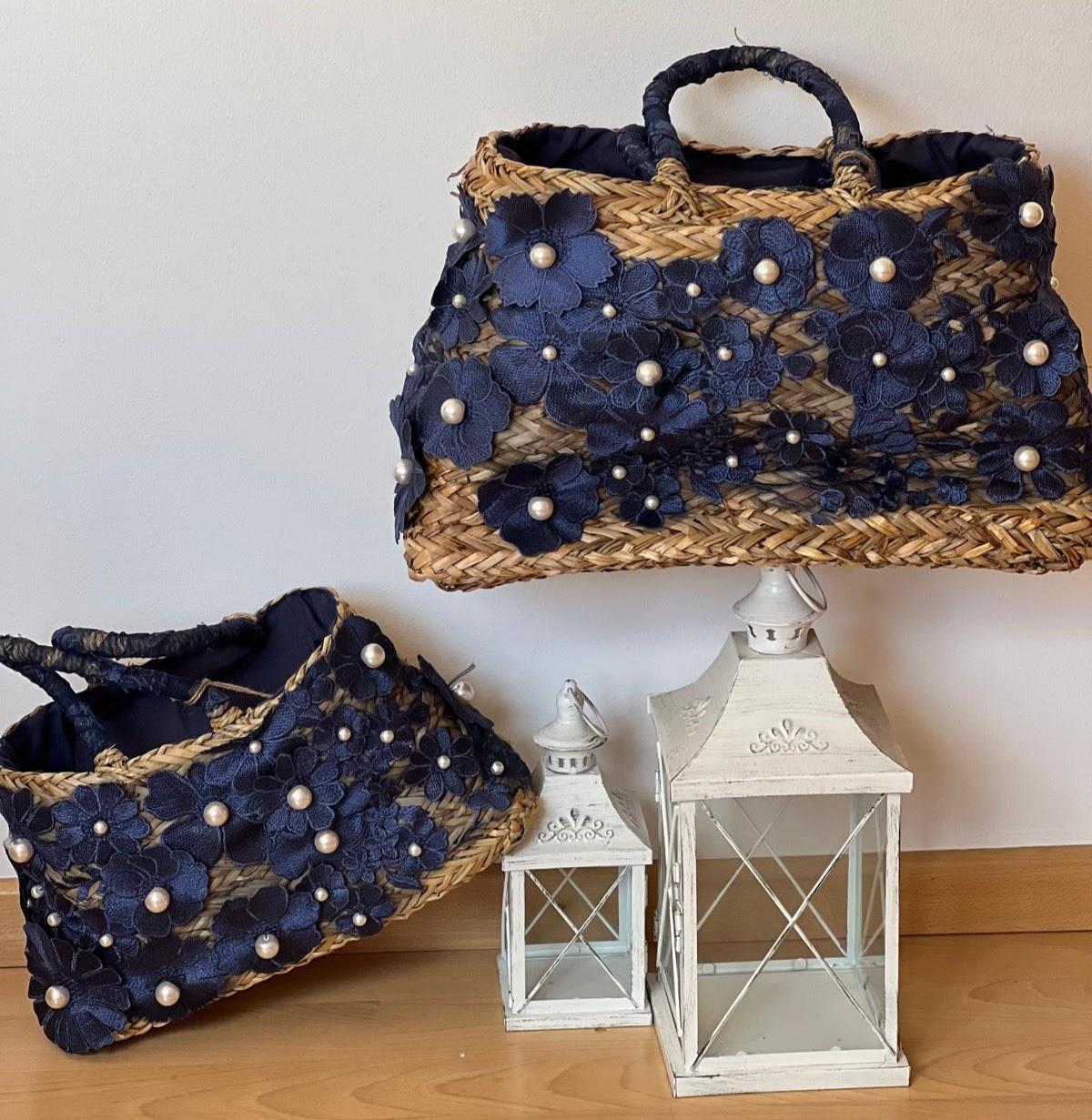 Capazo de rafia con flores bordadas en azul marino y perlas: un toque artesanal y elegante Grande