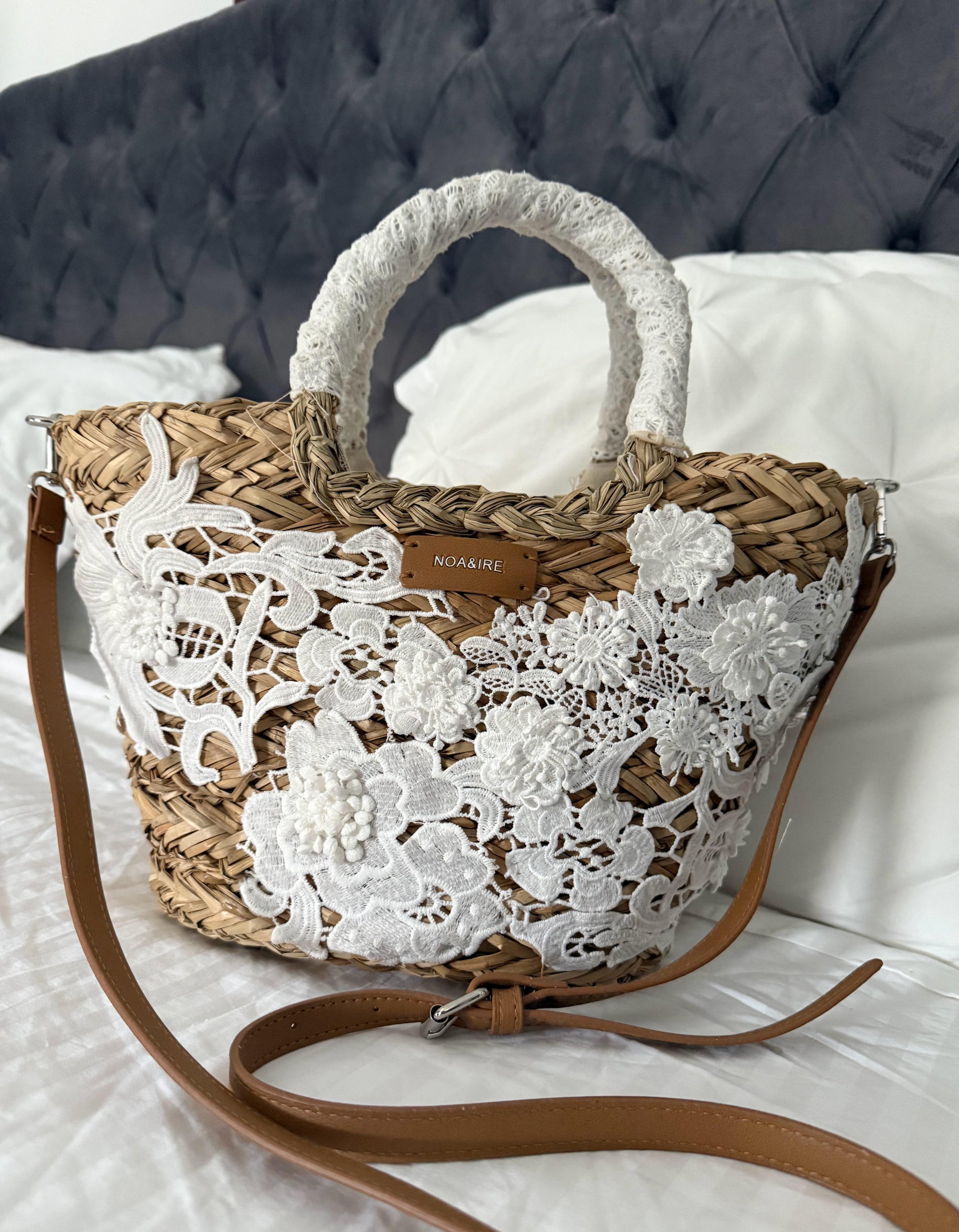 Capazo de rafia natural con encaje floral, ideal para un look bohemio y elegante