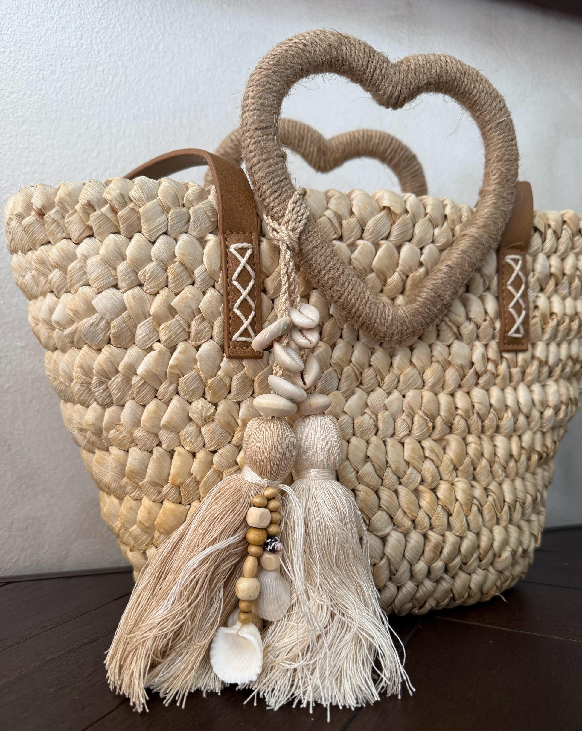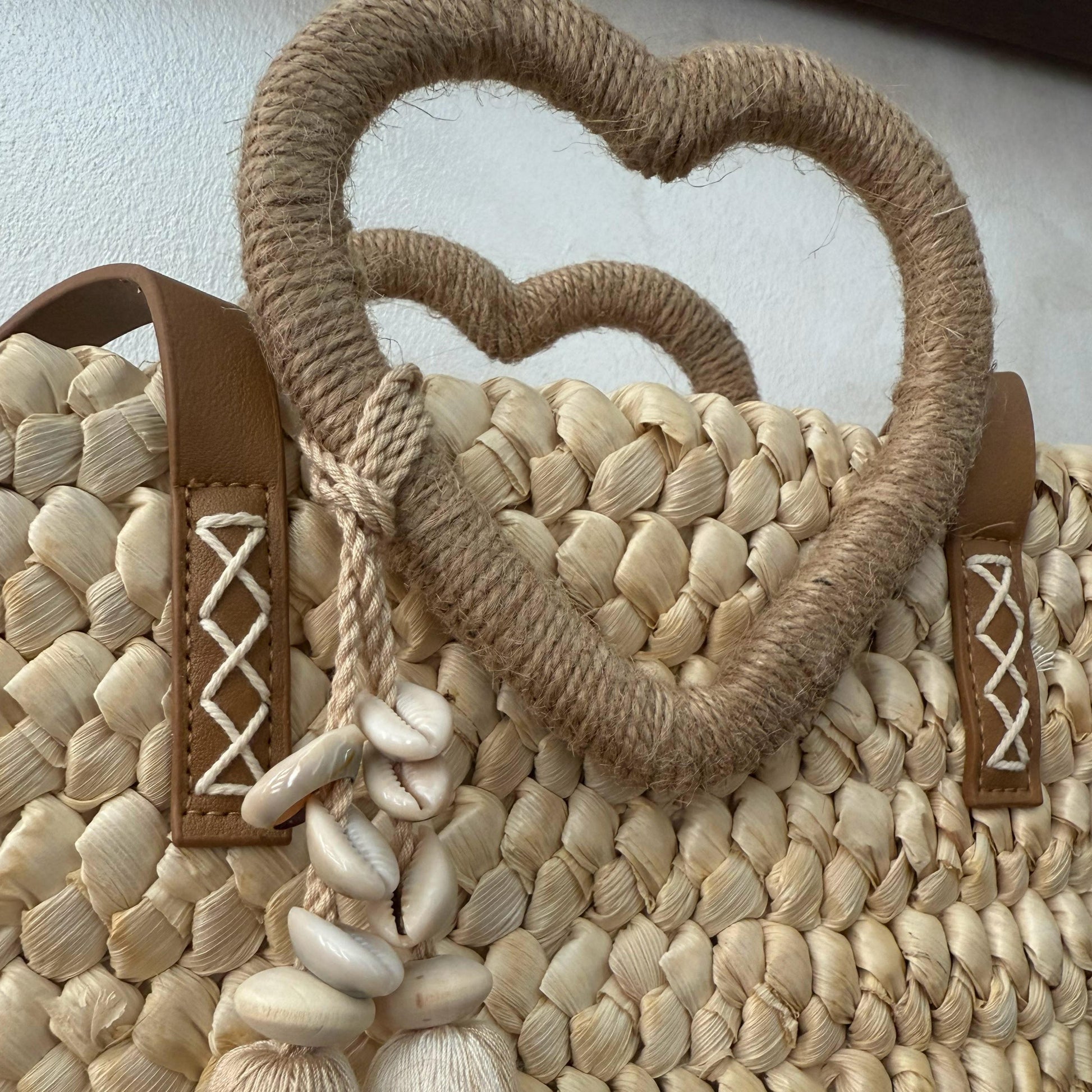 Capazo trenzado con asa en forma de corazón y detalles boho, perfecto para un estilo romántico y veraniego.