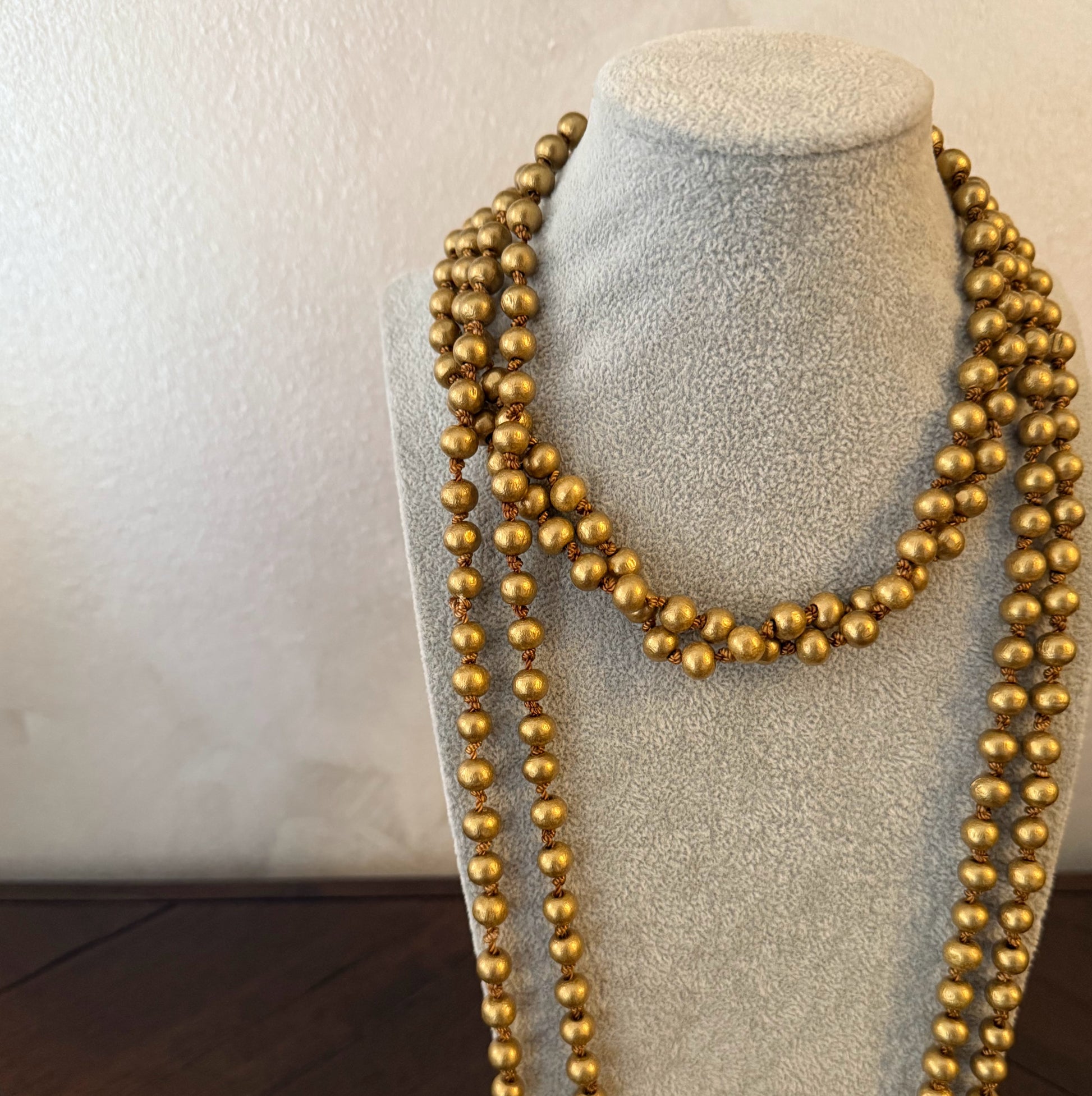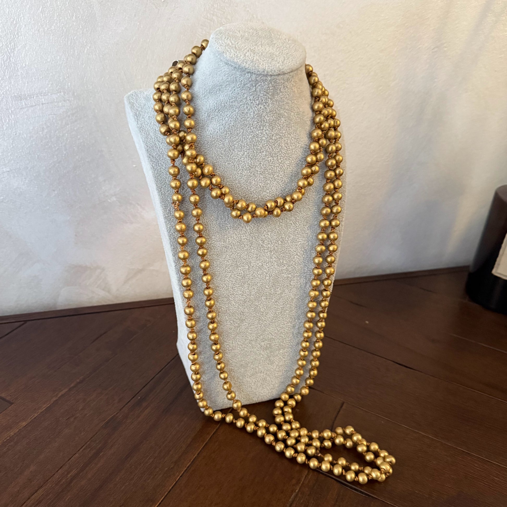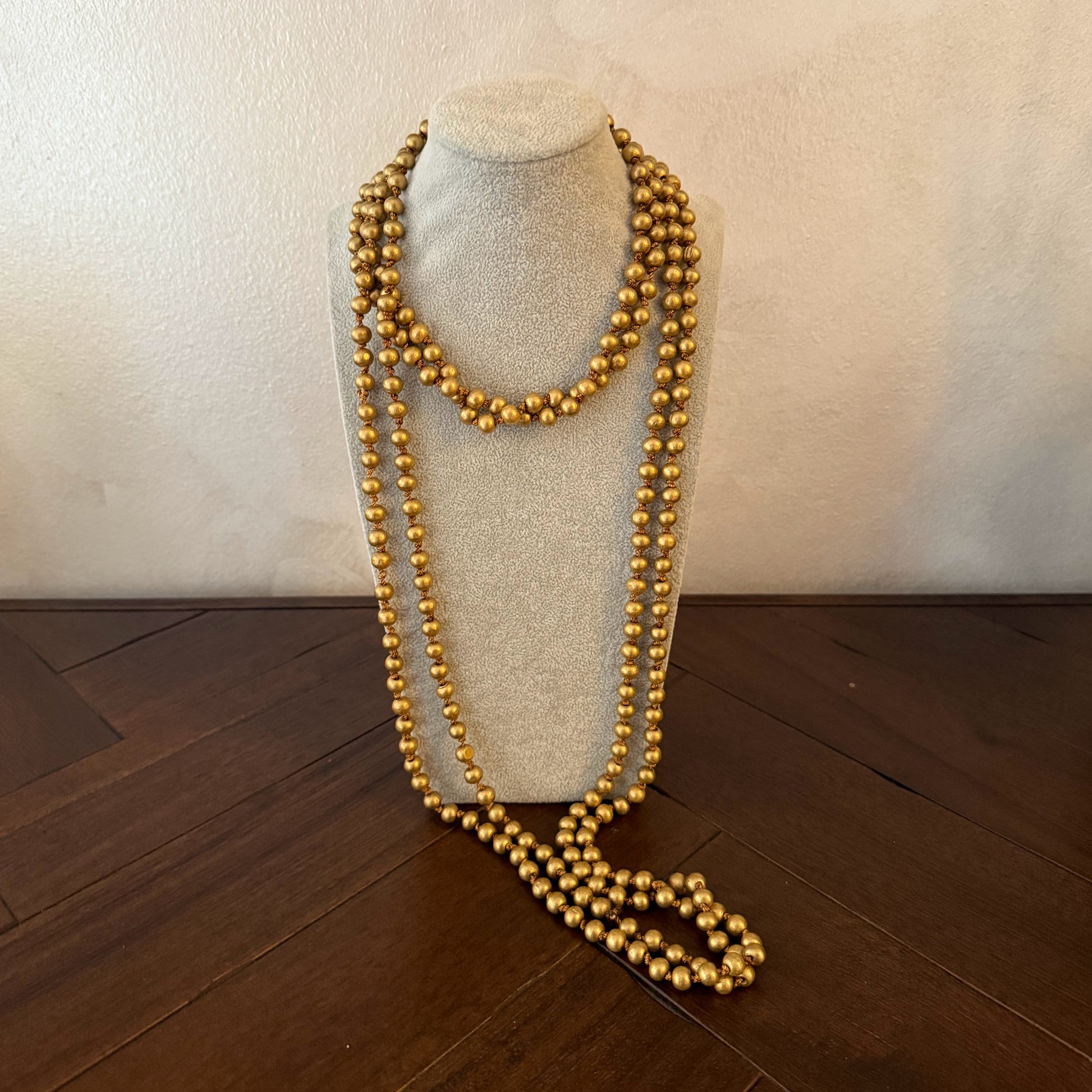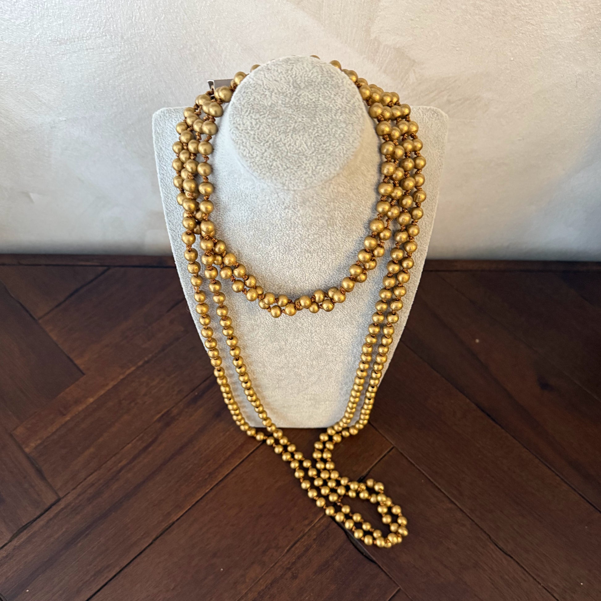 Collar largo compuesto por múltiples cuentas en tono dorado con acabado mate, ideal para dar un toque sofisticado y llamativo a cualquier look. Su diseño versátil permite llevarlo de diferentes formas: largo y suelto para un estilo elegante, o doble vuelta al cuello para un aire más moderno y casual. Perfecto para destacar tanto en ocasiones especiales como en outfits del día a día.