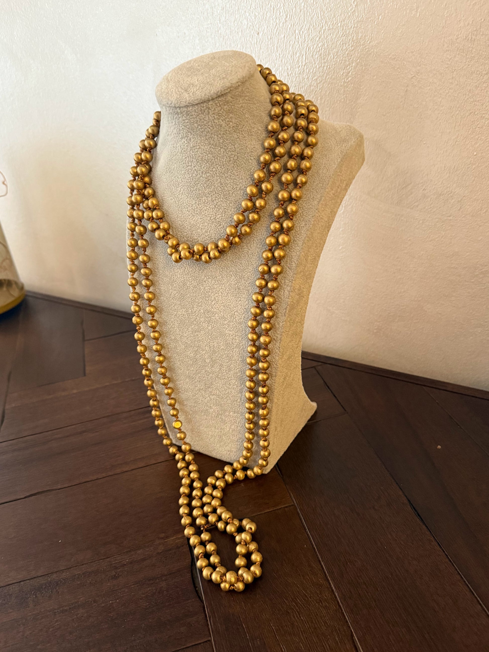 Collar largo de cuentas en color dorado.