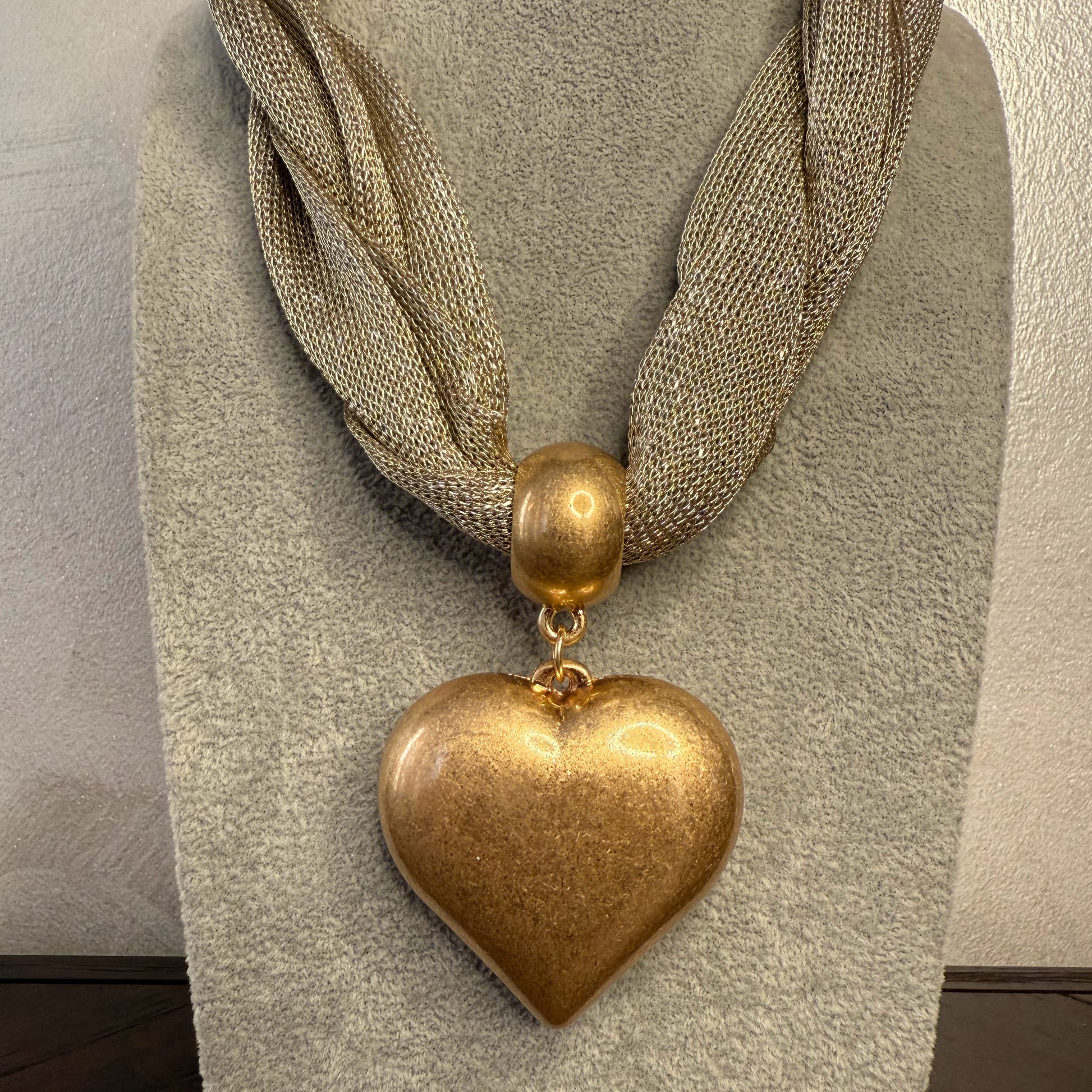 Collar elegante con diseño trenzado en tono dorado, acompañado de un colgante en forma de corazón que aporta un aire romántico y sofisticado. Su estilo llamativo lo convierte en la pieza perfecta para realzar cualquier look, tanto en ocasiones especiales como en outfits más casuales.